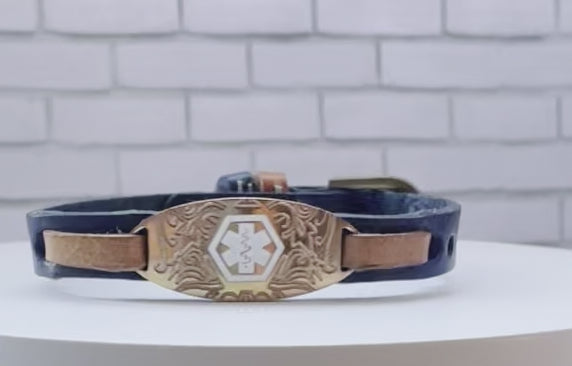 Halse Leather Medical Alert ID Bracelet in Navy & Tan - Personalised