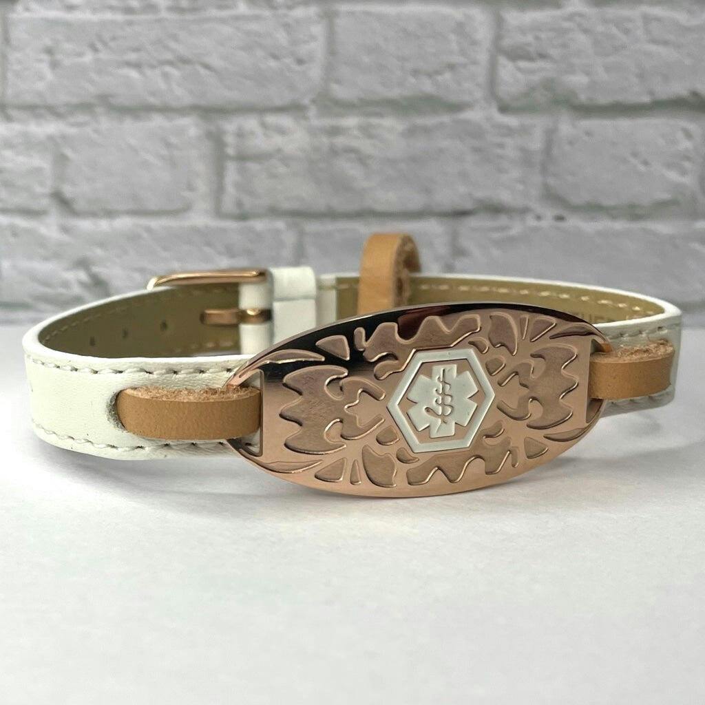 Rosalind medical alert bracelet is simple and classic. The high quality 10mm wide genuine leather strap is fully adjustable and the rose gold computed stainless steel plate is attached with a neutral leather. It is finished with matching a rose gold colour stainless steel watch style clasp. The engraving plate can easily be reversed to read your custom text.